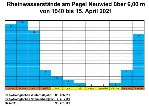 Die Verteilung der Hochwasserereignisse seit 1940 auf die einzelnen Monate zeigt deutlich, dass über 90 Prozent der relevanten Hochwasserabflüsse im hydrologischen Winterhalbjahr (1. November bis 30. April) stattfinden. Das liegt zum einen an den in Westeuropa vermehrten Niederschlägen in diesen Monaten und an der Schneeschmelze in den Frühjahrsmonaten.